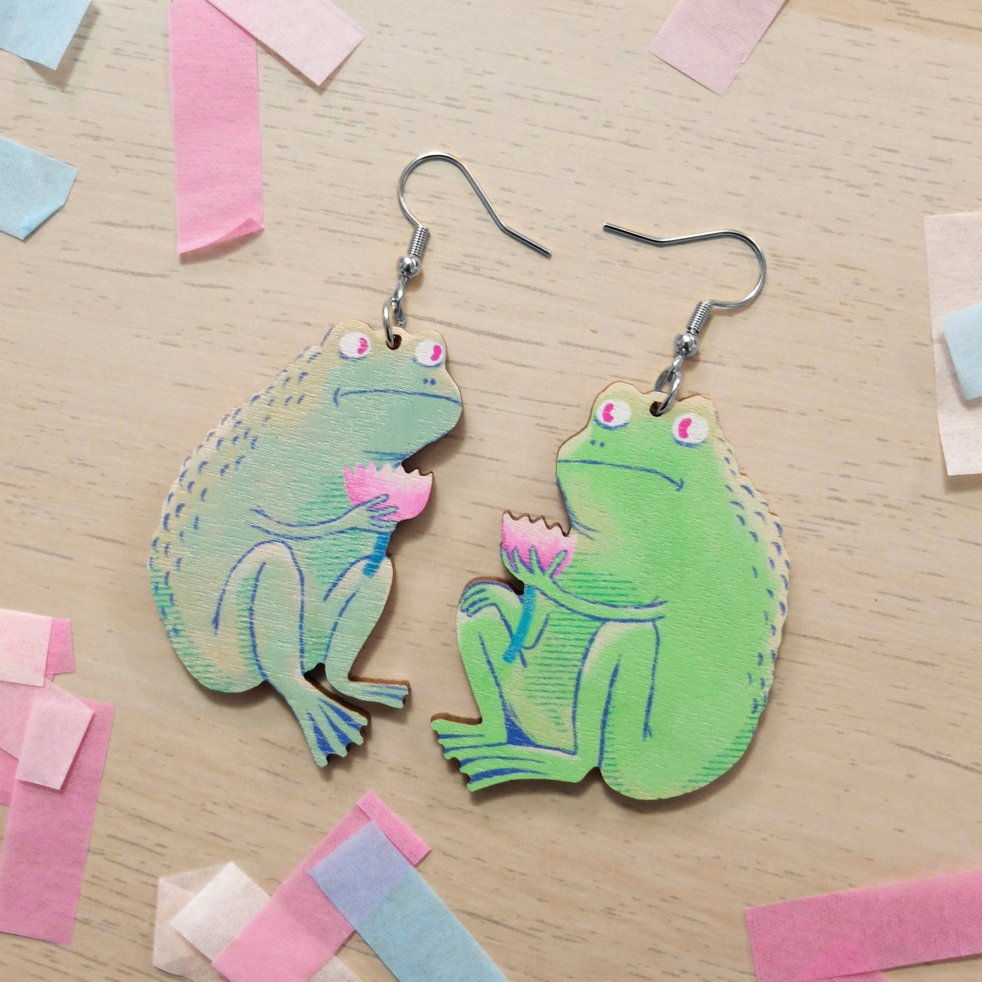 Froggy Datenight earrings with hook fastening by Valpuri Kerttula, an illustrator and artist based in Lahti, Finland.