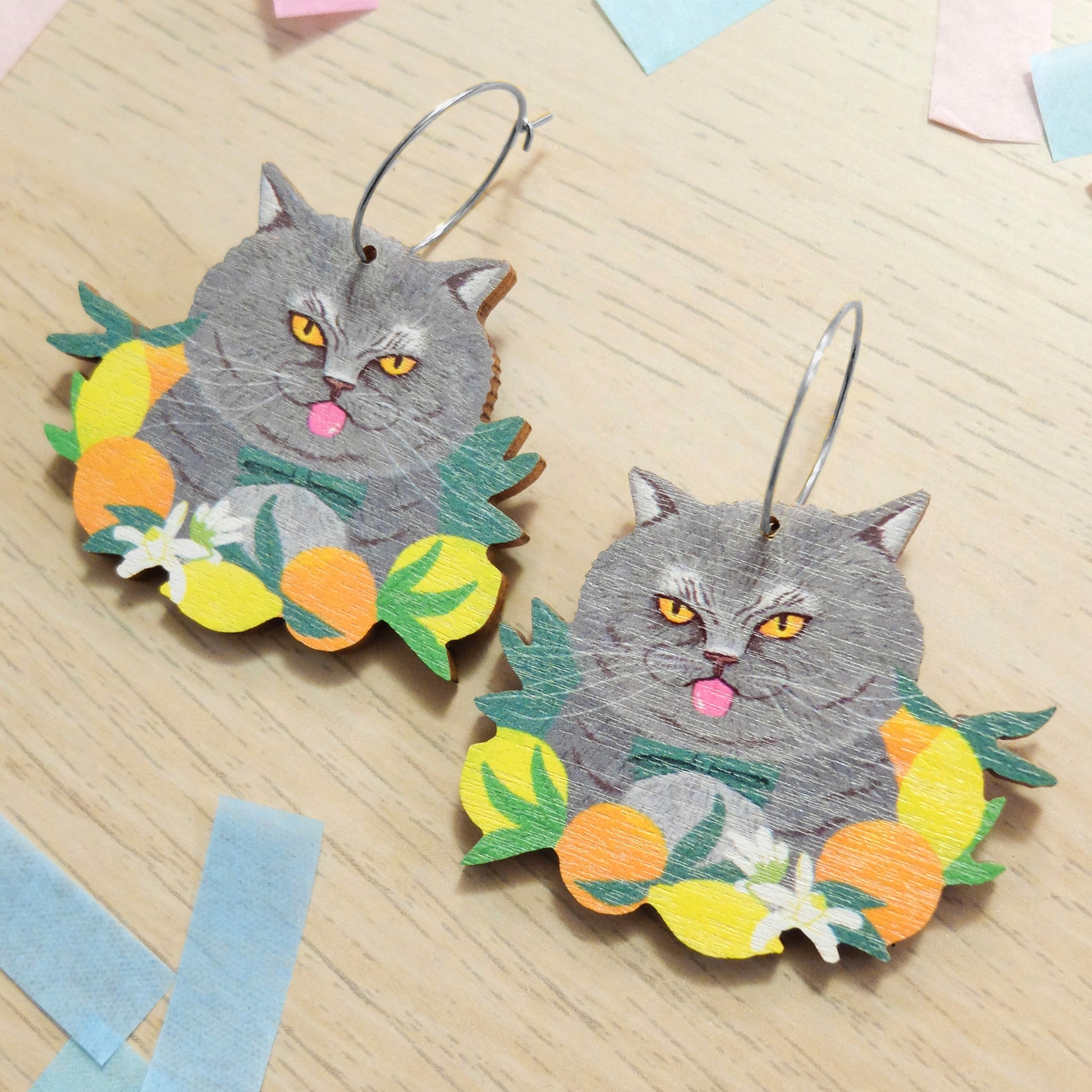 Lemon Cat earrings with hoop fastening by Valpuri Kerttula, an illustrator and artist based in Lahti, Finland.