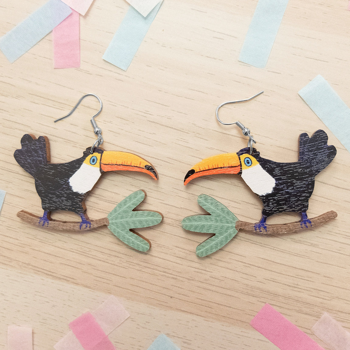 Toucan earrings with hook fastening by Valpuri Kerttula, an illustrator and artist based in Lahti, Finland.